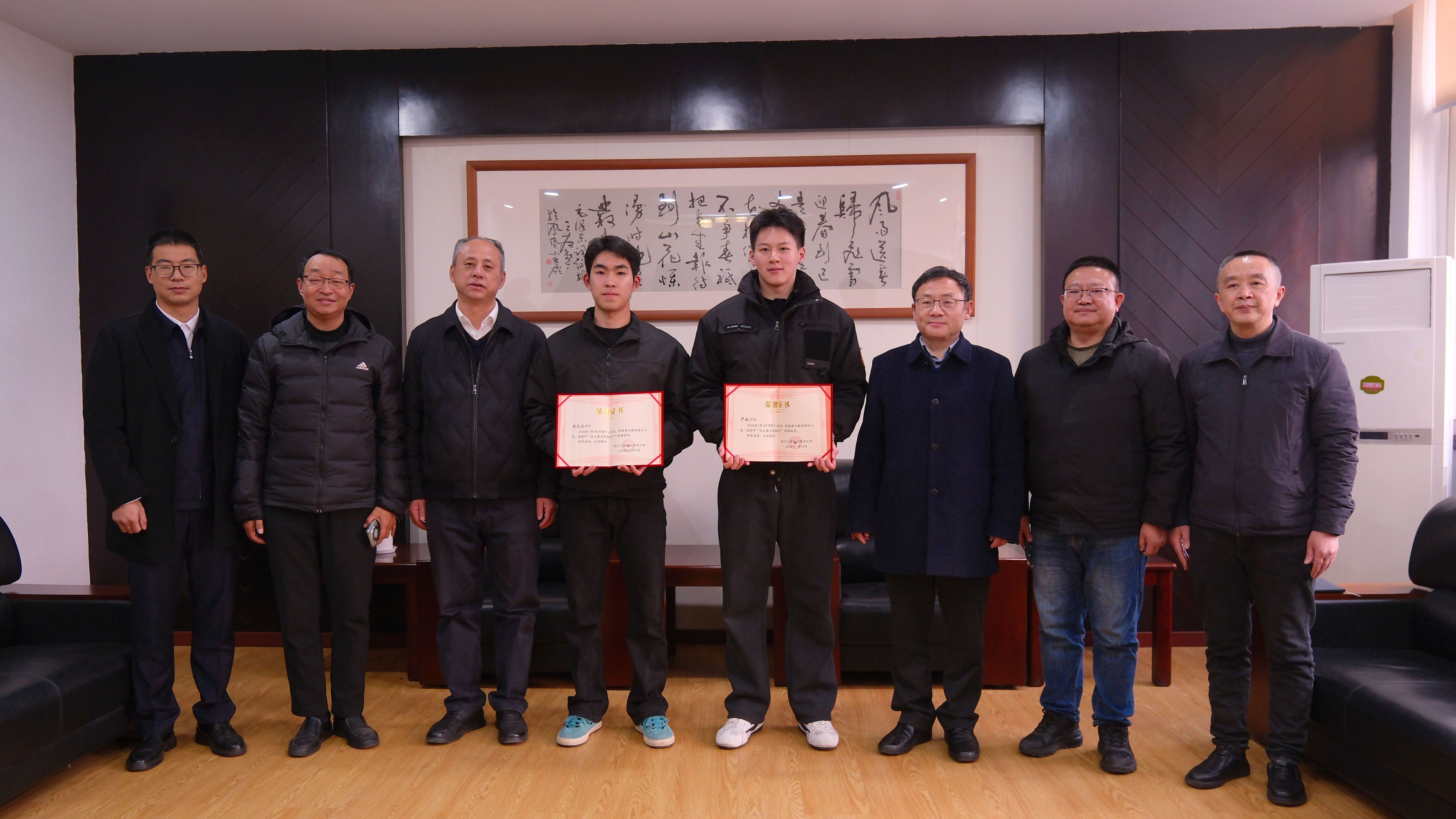 1月15日,学校对体育与健康学院2023级尹航、赖志刚两位同学勇救落水者义举予以表彰。学校党委书记蔡玉波向两名同学颁发荣誉证书,授予他们“见义勇为积极分子”荣誉称号,盛赞他们在危急时刻,沉着冷静、勇于施救,充分彰显了工大学子良好的精神风貌和责任担当。党委副书记唐文辉,宣传部、学生处、保卫处相关负责人参加活动。