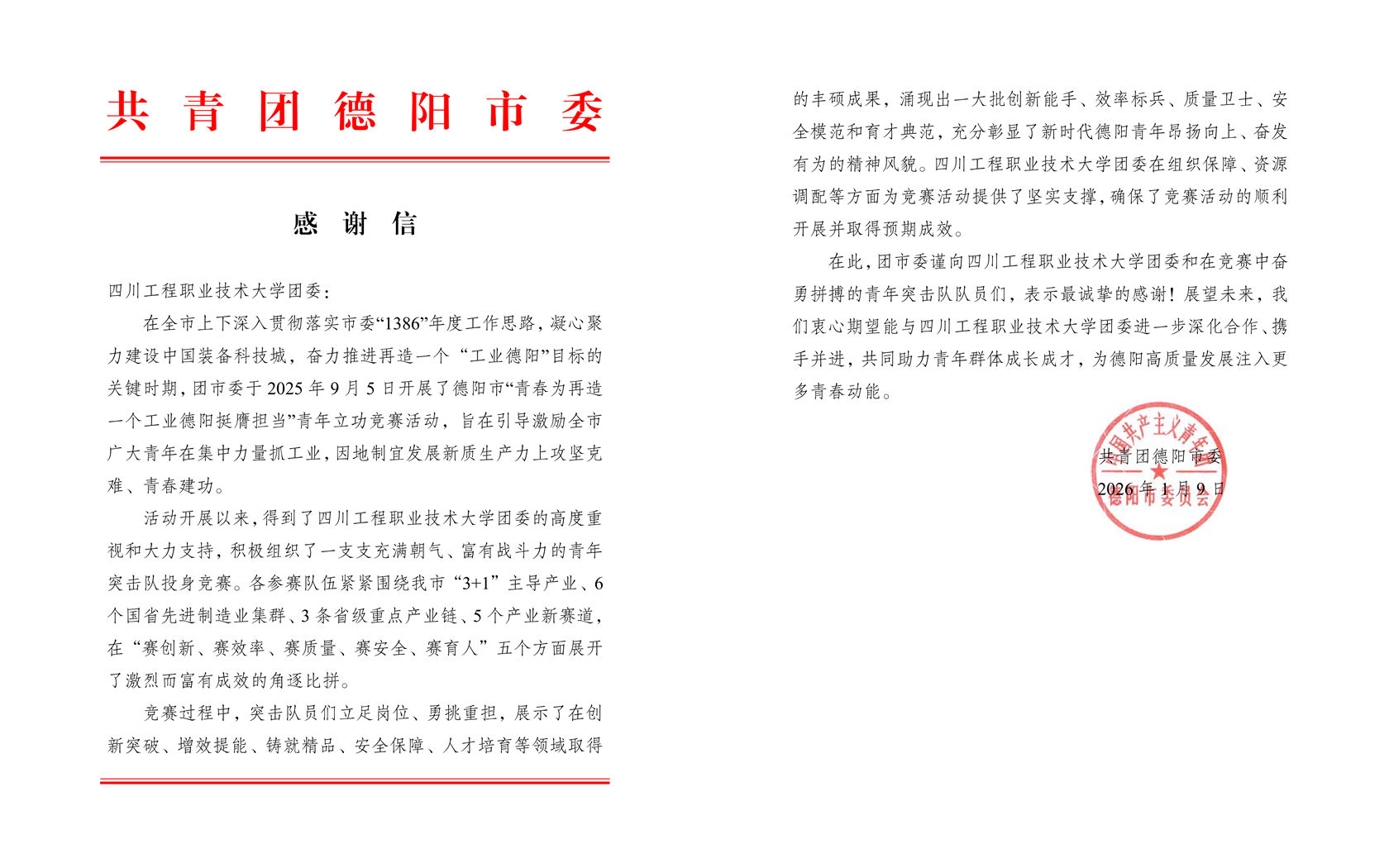 1月9日,共青团德阳市委向我校发来感谢信,对我校团委积极组织一支支充满朝气、富有战斗力的青年突击队,投身德阳市“青春为再造一个工业德阳挺膺担当”青年立功竞赛活动表示诚挚感谢与高度肯定。