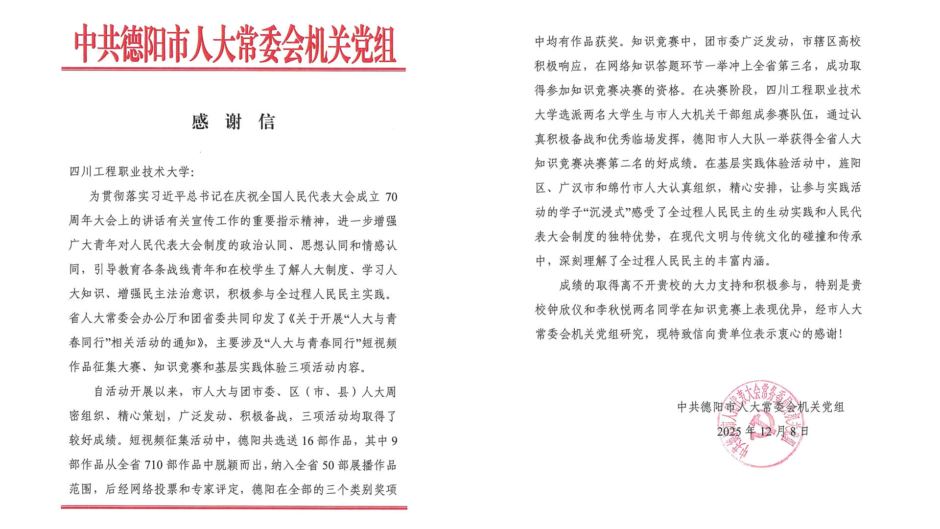近日,中共德阳市人大常委会机关党组向我校发来感谢信,对我校在“人大与青春同行”系列活动中的大力支持和积极参与表示衷心感谢,特别肯定了我校钟欣仪、李秋悦两名同学在全省人大知识竞赛中的优异表现,助力德阳市荣获全省决赛第二名的佳绩。
