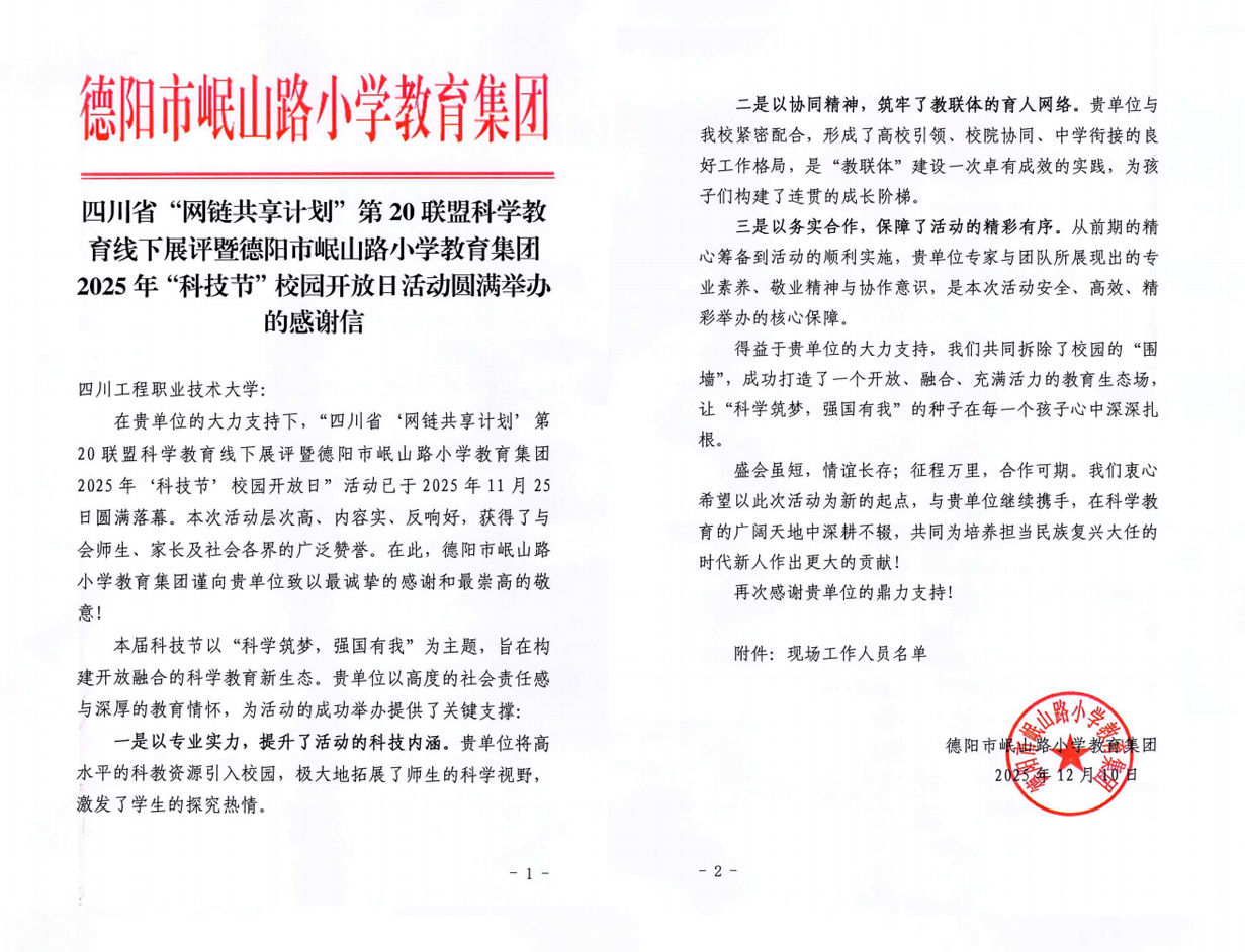 近日,学校收到来自德阳市岷山路小学教育集团的感谢信,对我校在“四川省‘网链共享计划’第20联盟科学教育线下展评暨德阳市岷山路小学教育集团2025年‘科技节’校园开放日”活动中给予的大力支持与专业贡献,表示诚挚的感谢。