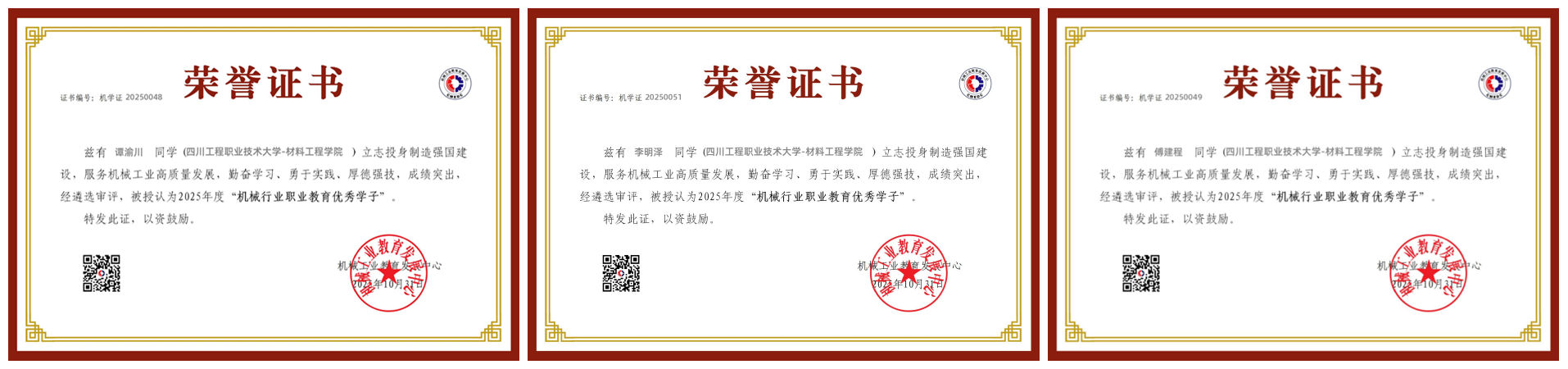 近日,首届“机械行业职业教育优秀学子”遴选认定结果正式公布,我校材料工程学院谭渝川、李明泽、傅建程三位同学凭借扎实的学业功底、突出的专业技能和全面的综合素质,一同获评2025年度“机械行业职业教育优秀学子”称号。该遴选工作由机械工业教育发展中心联合全国机械职业教育教学指导委员会等权威机构共同组织,是机械行业面向职业院校学生设立的最高级别荣誉之一。此次获奖,既是对三位同学在校期间不懈奋斗的权威认可,更是学校深耕职业教育、注重人才培养质量的生动彰显。