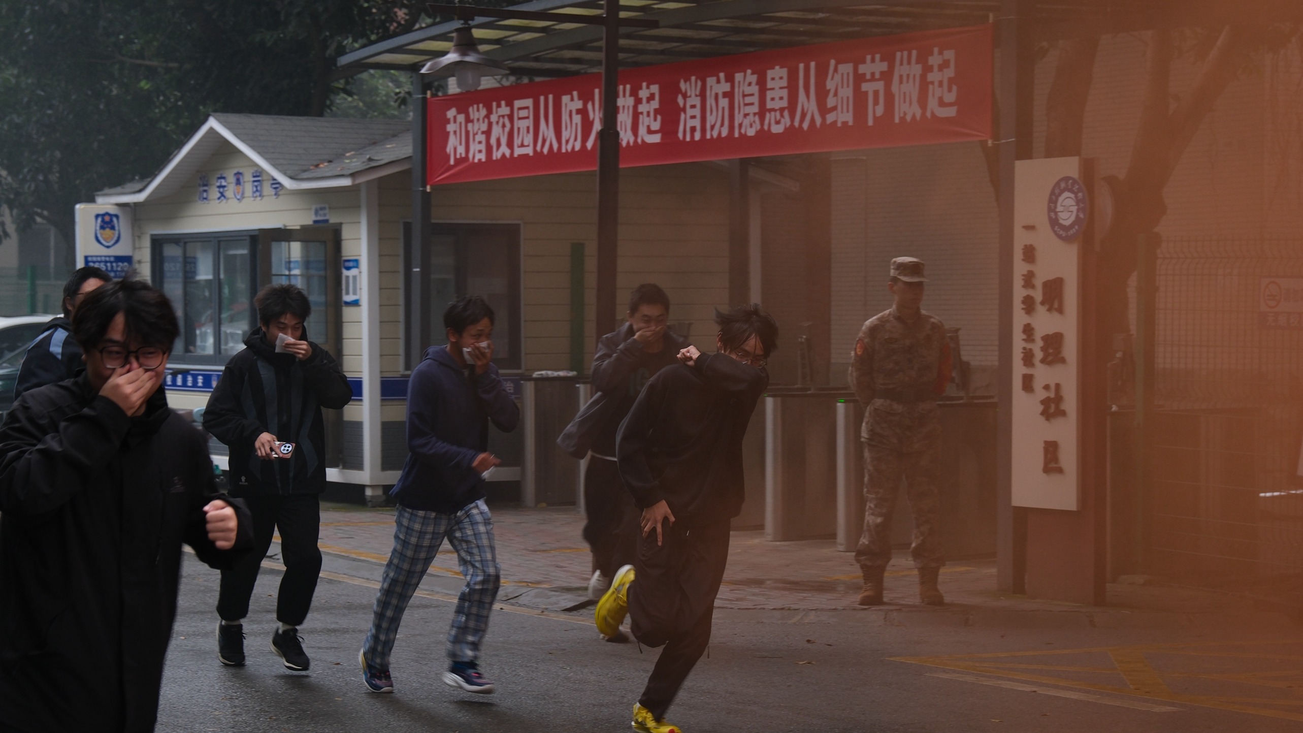 14时15分,演练正式在学生公寓各楼栋相继展开。在释放烟雾弹后,随着紧急哨声响起,参演学生迅速反应,按照预案要求弯腰低姿、用湿毛巾捂住口鼻,沿指定疏散路线有序撤离。整个过程组织严密、响应迅速,全体学生均安全、快速地到达指定集合点。