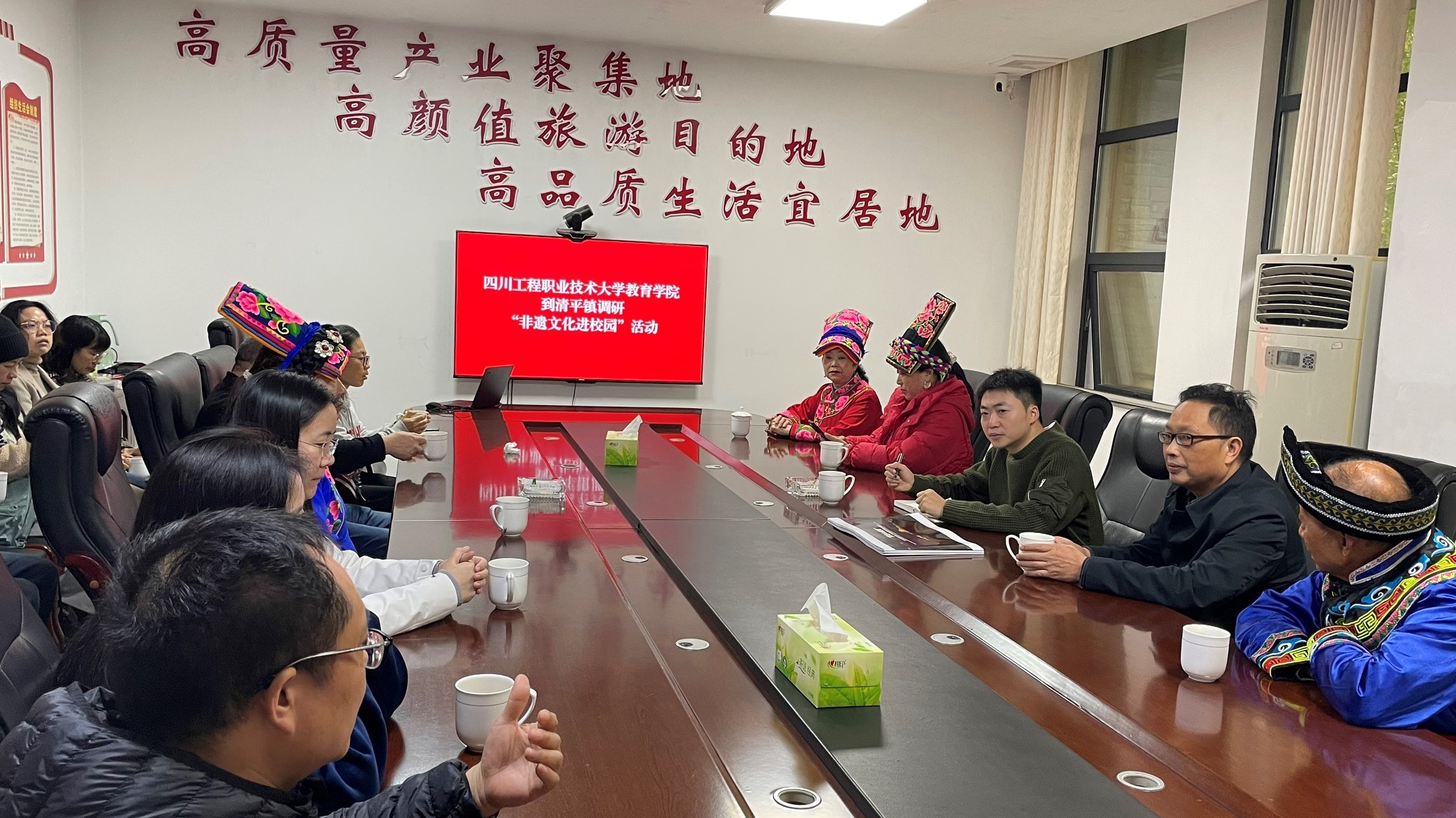为进一步深化校地协同发展,学校中华优秀传统文化研究中心、教育学院语文教研室还与清平镇人民政府举行了专题会谈。会谈围绕研学基地建设、高校服务地方文旅发展、山歌非遗文化进校园等关键话题展开热烈交流。清平镇副镇长杨宇详细介绍了该镇文旅产业发展现状及未来规划,强调清平镇依托独特的生态资源与文化底蕴,正全力推进文旅融合高质量发展,对与德阳本地高校开展深度合作充满信心。