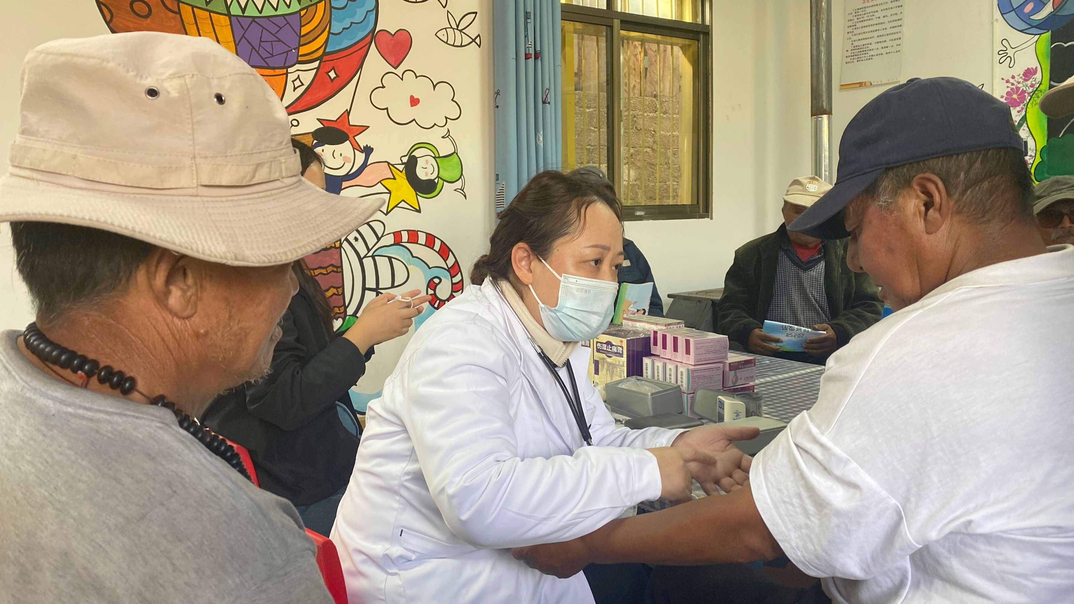 关注乡村老年群体的健康福祉是此次帮扶的重点之一。工作队在麻藏村甲吉村、上黄寨村设立了临时义诊服务点,宣传秋冬季常见传染病预防知识,耐心细致地为前来询诊的老年村民进行常规健康检查,包括测量血压、检测血糖等,并提供专业的健康咨询。针对高原地区常见病、多发病,校医院医生给予了详细的防护指导。同时,工作队还向老人们赠送了内含常用药品和医疗物资的急救包,这份贴心的“健康礼包”让老人们倍感温暖。