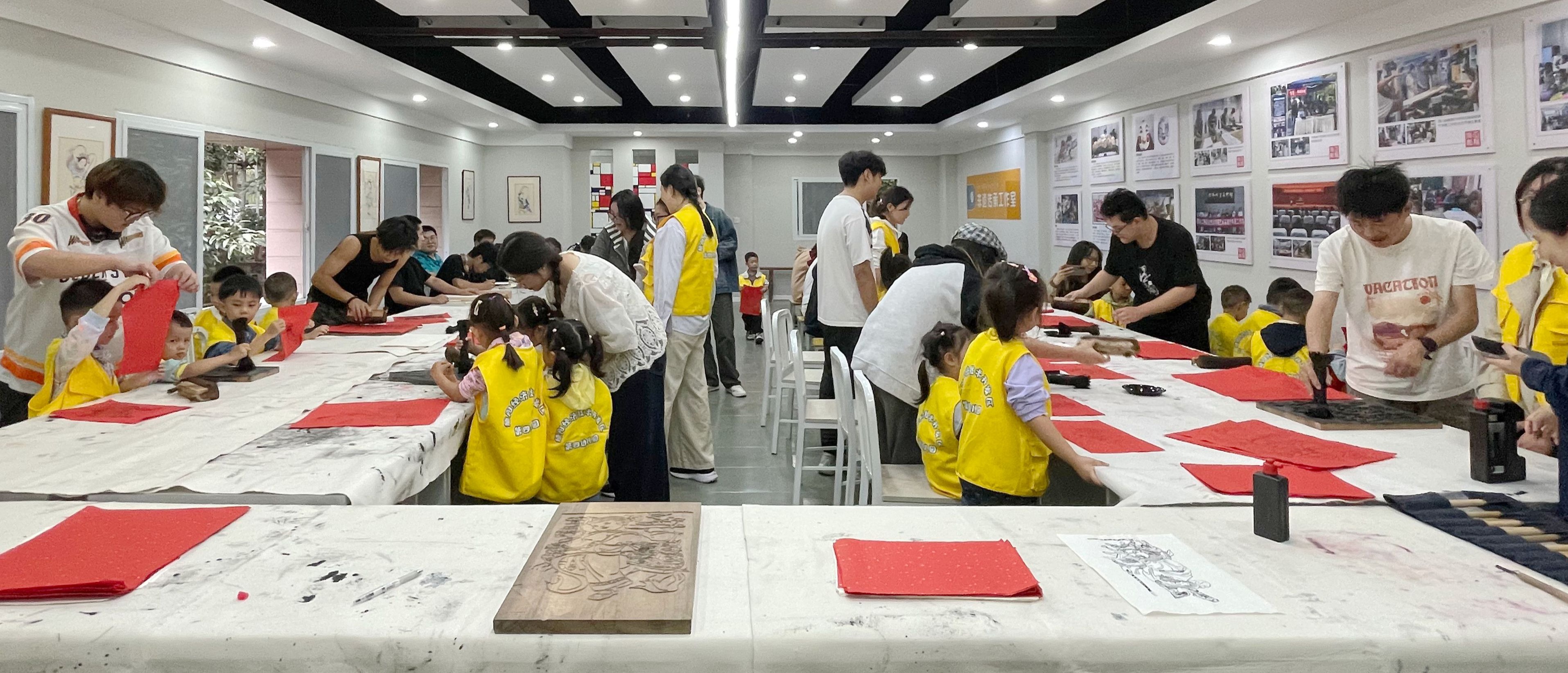 在绵竹年画体验环节,非遗传承人张琴老师通过实物展品,向小朋友们讲解绵竹年画“门神驱邪”“福娃纳吉”的文化寓意,展示“起稿、刻版、印刷、彩绘”的传统工艺流程。随后,小朋友们在绵竹年画研习社成员的耐心指导下,上手体验年画传统拓印技艺。现场气氛热烈,当一幅幅精美的年画线稿跃然纸上,小朋友们的惊叹声此起彼伏。