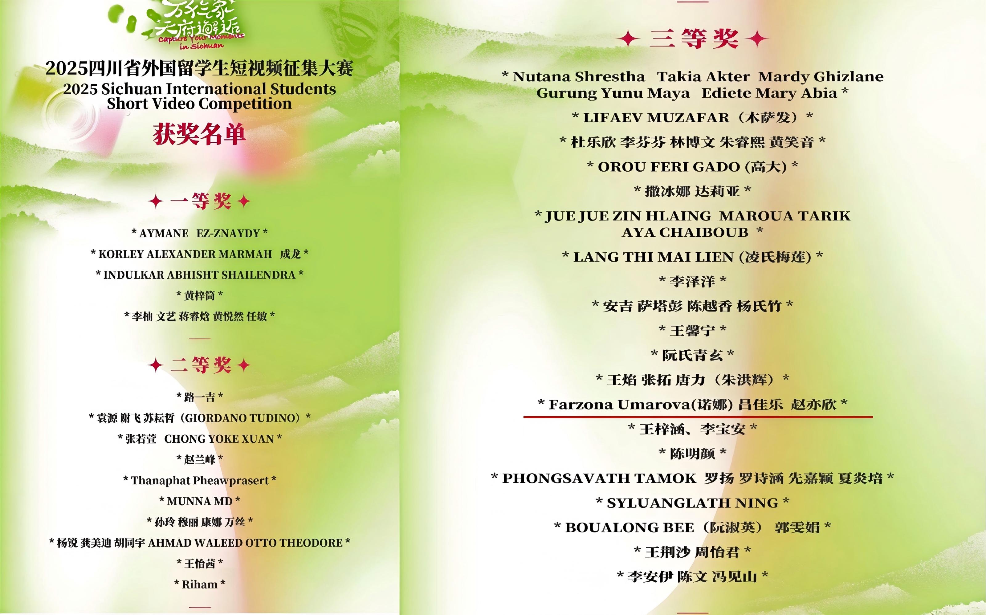 近日,由四川省广播电视局、四川省教育厅指导,四川国际传播中心主办的“万千气象・天府邂逅”2025四川省外国留学生短视频征集大赛获奖结果揭晓。我校旅游管理学院旅游英语专业学生吕佳乐、赵亦欣与我校留学生诺娜(Farzona Umarova)携手创作的作品《诺娜的德阳拼图》,在全省420余件参赛作品中脱颖而出,荣获三等奖。