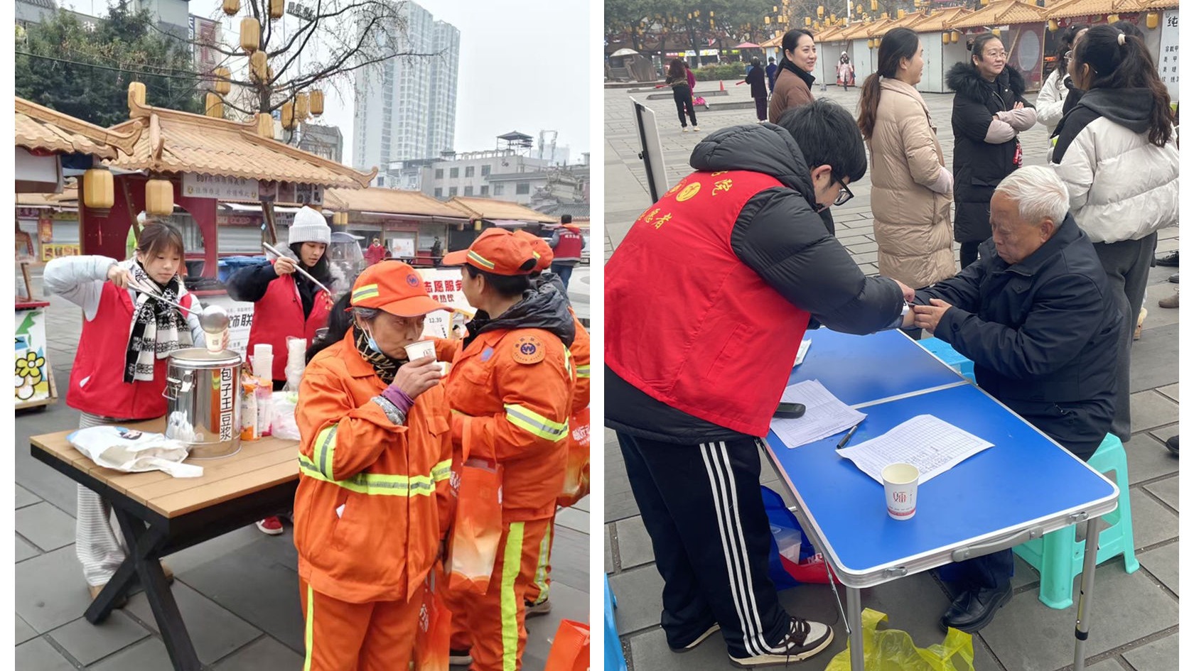 12月30日,文庙社区张灯结彩,暖意融融。学院志愿者与社区工作人员共同设置多个便民服务点,为居民带来冬日温暖。免费热饮区为环卫工人、社区老人送上热气腾腾的豆浆与银耳汤;爱心义剪摊位让户外工作者焕发新颜;免费贴膜、测血压服务细致贴心,赢得居民连连称赞。一抹亮丽的“志愿红”活跃在社区各个角落,将元旦的温暖祝福和“奉献、友爱、互助、进步”的志愿精神落到实处。