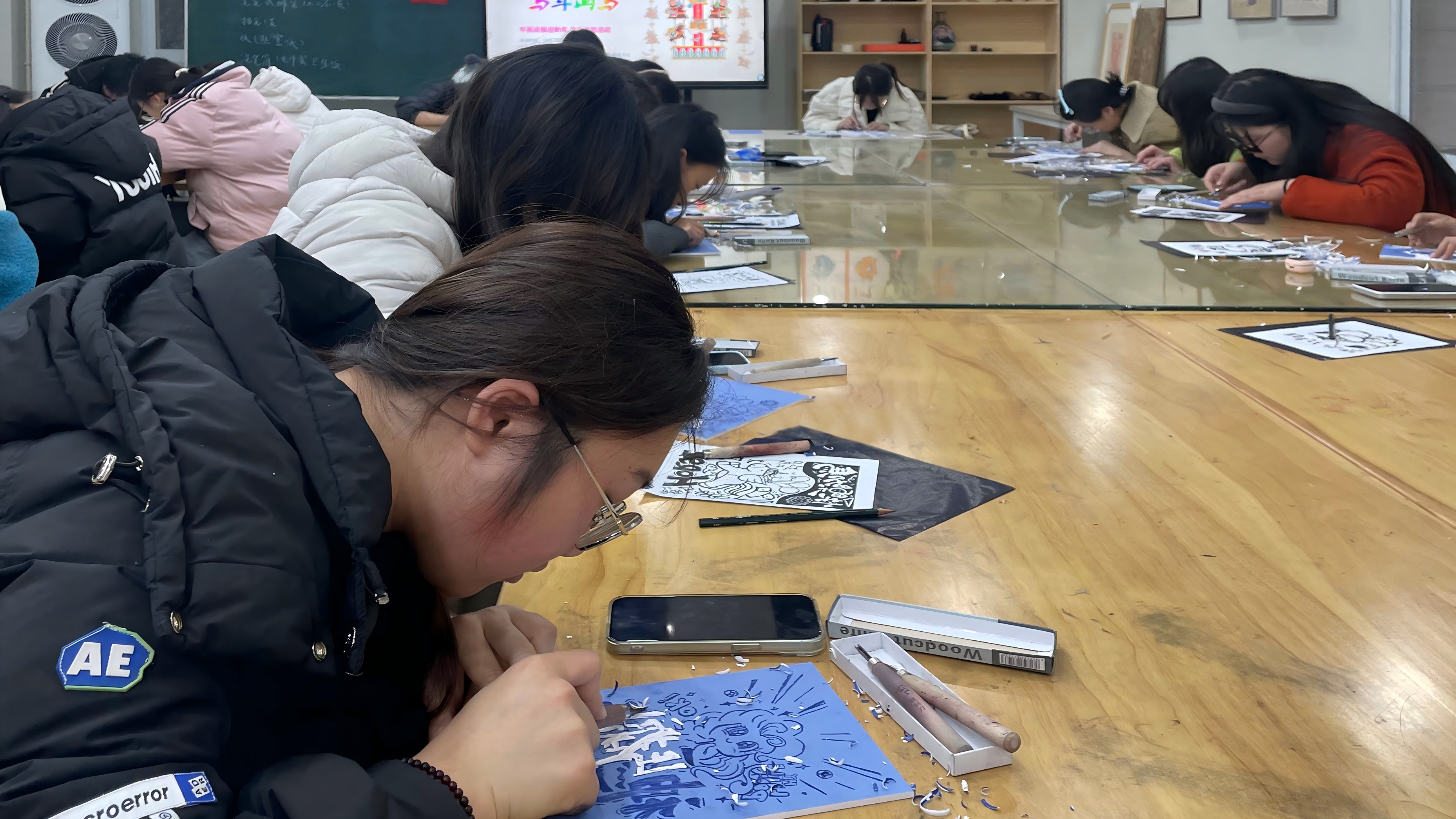创作现场,师生们围绕骏马造型的灵动勾勒、祥云、牡丹、元宝等吉祥元素的搭配组合展开热烈研讨与经验交流。刻刀起落间、笔墨晕染中,一幅幅形态鲜活、寓意隽永的马年年画渐次成型:或展现骏马奔腾的昂扬雄姿,或勾勒马伴福运的温馨场景,每一笔勾勒、每一刀雕琢都饱含着师生对新年的美好期许。活动尾声的分享交流环节气氛热烈,同学们踊跃登台,畅谈作品创意构思,分享对马年生肖文化的理解感悟,部分同学还带来了家乡特色年俗故事,让活动现场成为传统文化交流互鉴的温馨平台,欢声笑语中流淌着浓浓的年味与温情。
