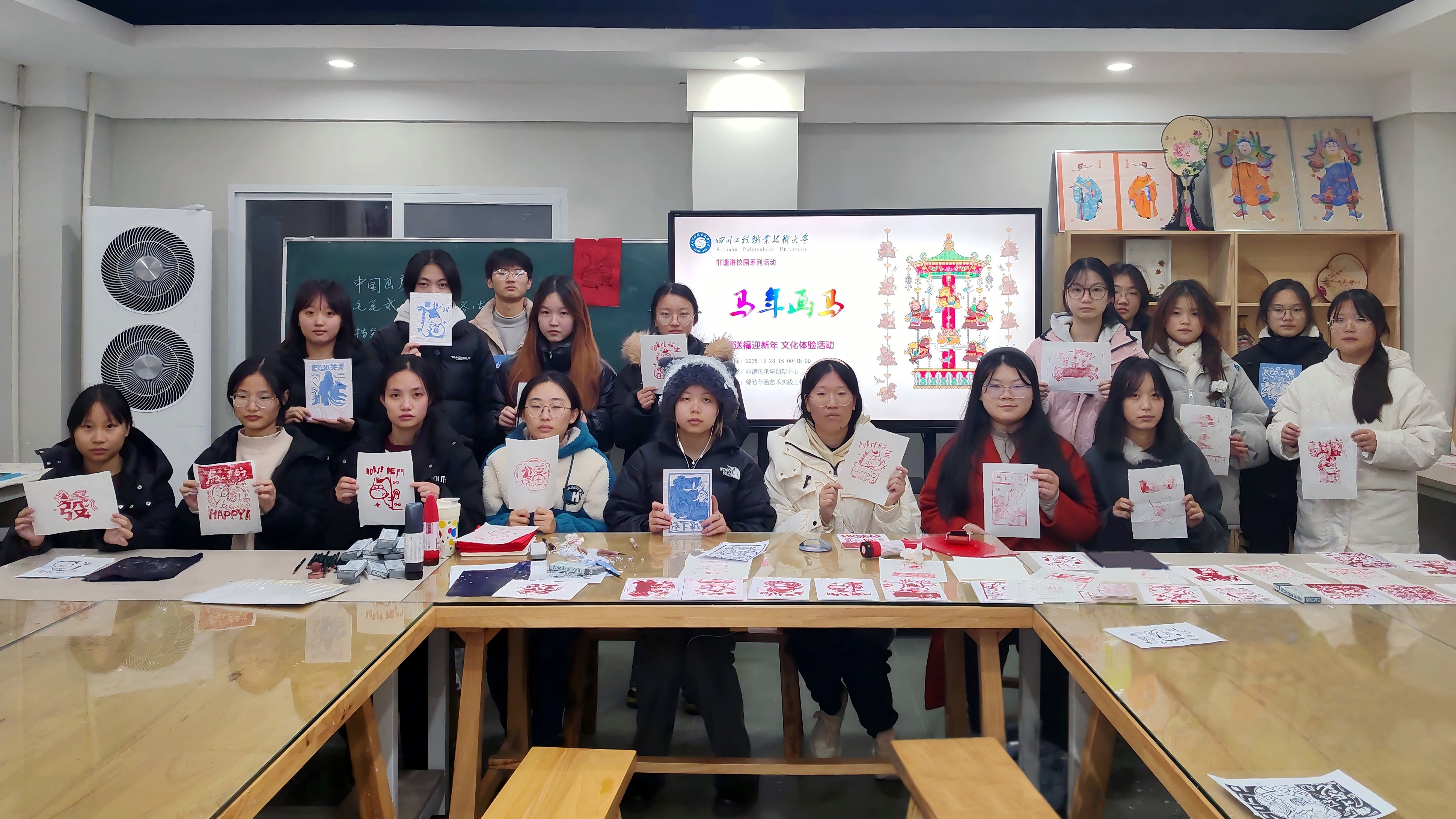 灵驹献瑞启新程,年画传情贺新春。近日,由学校非遗传承与创新中心主办、绵竹年画研习社承办的“马年画马”年画送福迎新年活动在校园内顺利开展。本次活动以马年生肖文化为核心纽带,引领师生在手工创作中沉浸式感受传统年俗的独特魅力,为2025年“非遗进校园”系列活动画上圆满句号。
