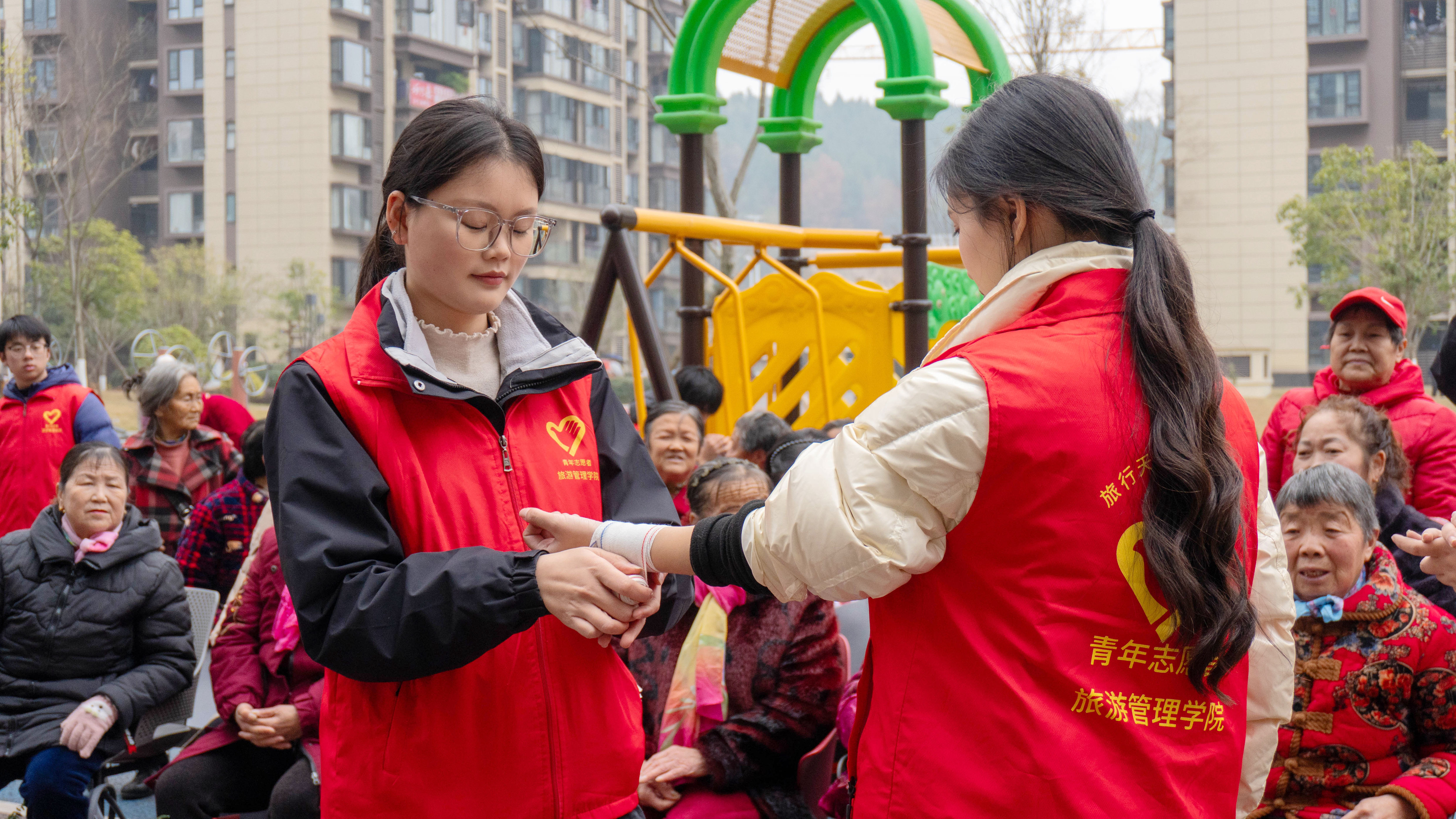 为深入贯彻党的二十大精神,推动志愿服务与社会实践深度融合,助力地方文化传承与社区治理,12月19日下午,旅游管理学院“心旅微光”志愿服务队在学院党总支分管负责人于浣、辅导员肖肖、专业课教师白鑫、廖其凡的带领下,走进德阳市旌阳区拱桥社区,开展了“银龄拾韵”传统文化体验营活动。拱桥社区书记张银宏热情接待了志愿团队,并对大学生们的到来表示诚挚欢迎。