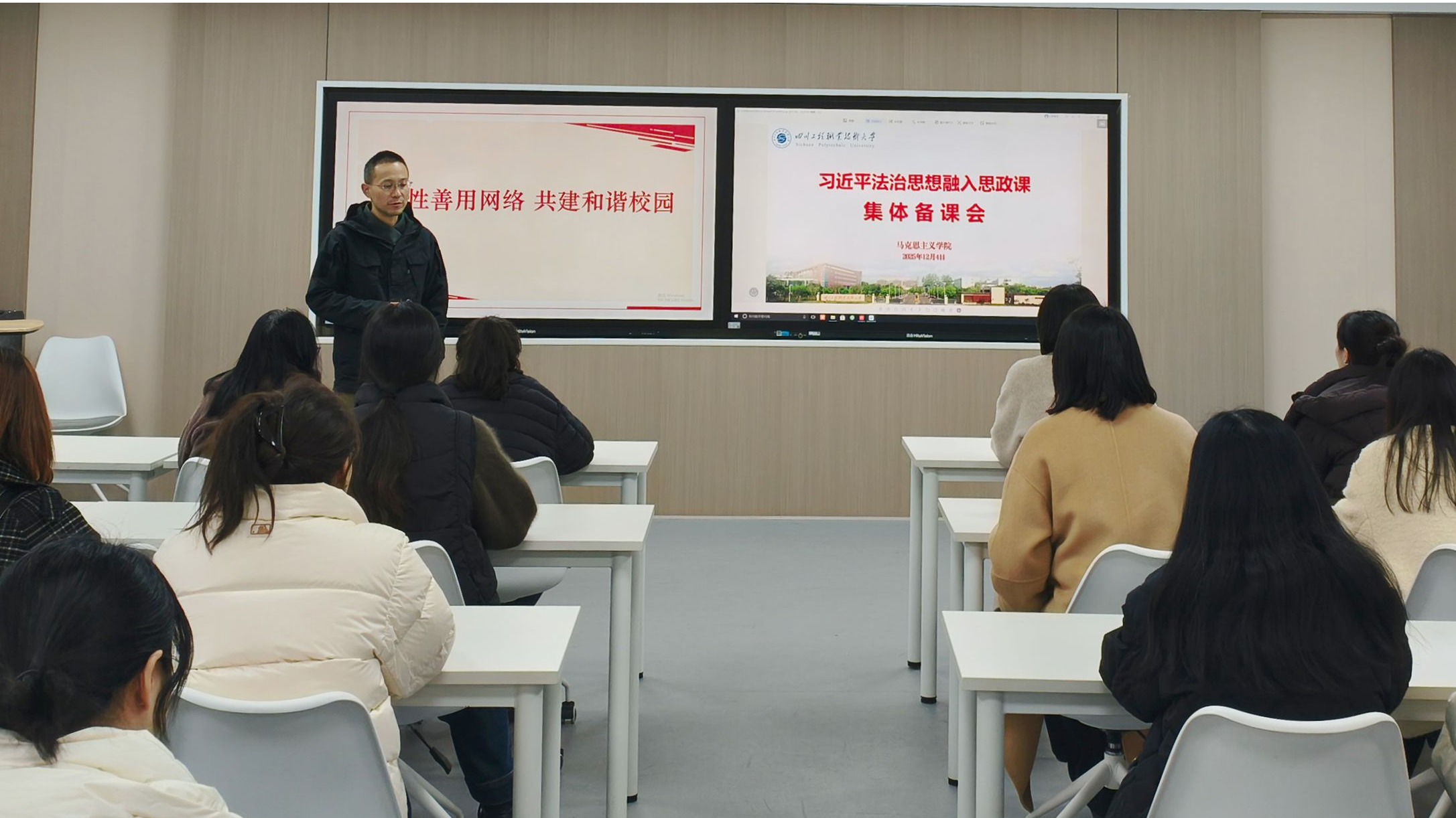 为深入弘扬宪法精神、厚植校园法治信仰,12月4日下午,马克思主义学院举办习近平法治思想融入思政课集体备课会。全体思政课教师齐聚一堂,聚焦网络法治教育热点,共同探索将法治精神转化为课堂教学实效的创新路径。