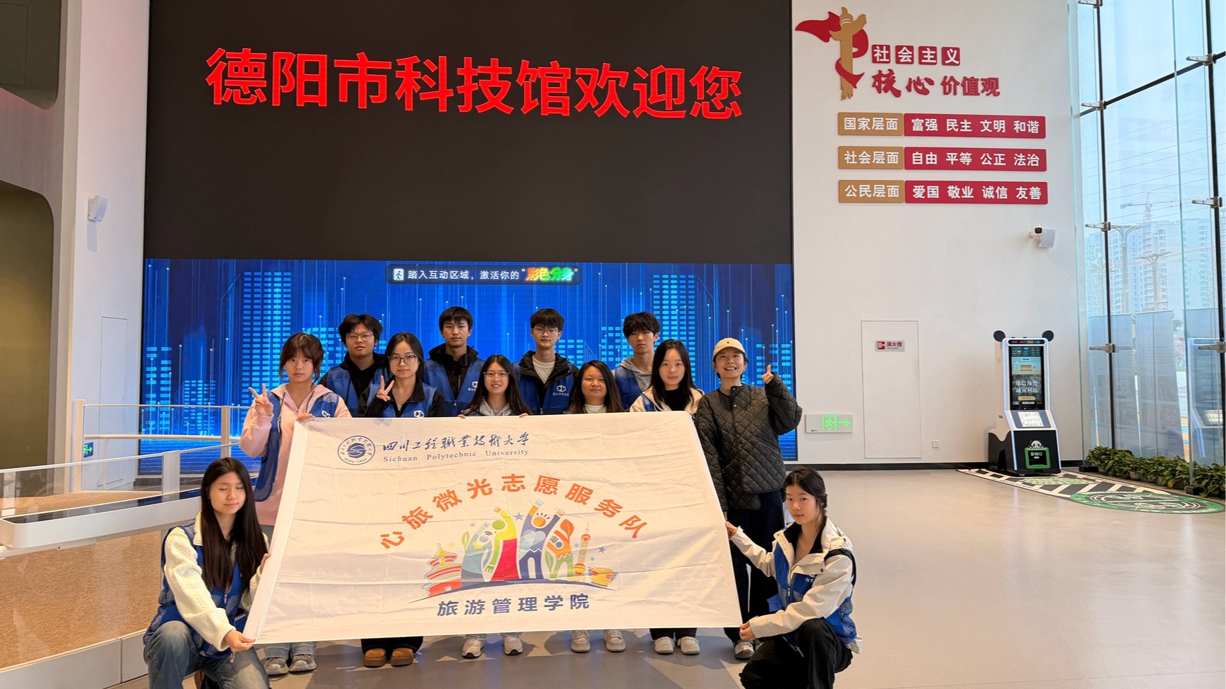“心旅微光”志愿服务队自成立以来,始终秉持“服务地方、奉献社会”的宗旨,多次参与德阳市各类文旅、科普、会展等公共服务活动,已成为学院实践育人、服务社会的重要平台。此次再度与德阳市科技馆合作,不仅提升了学生的社会实践能力,也进一步深化了校地合作内涵,助力德阳科普事业与文旅融合发展。