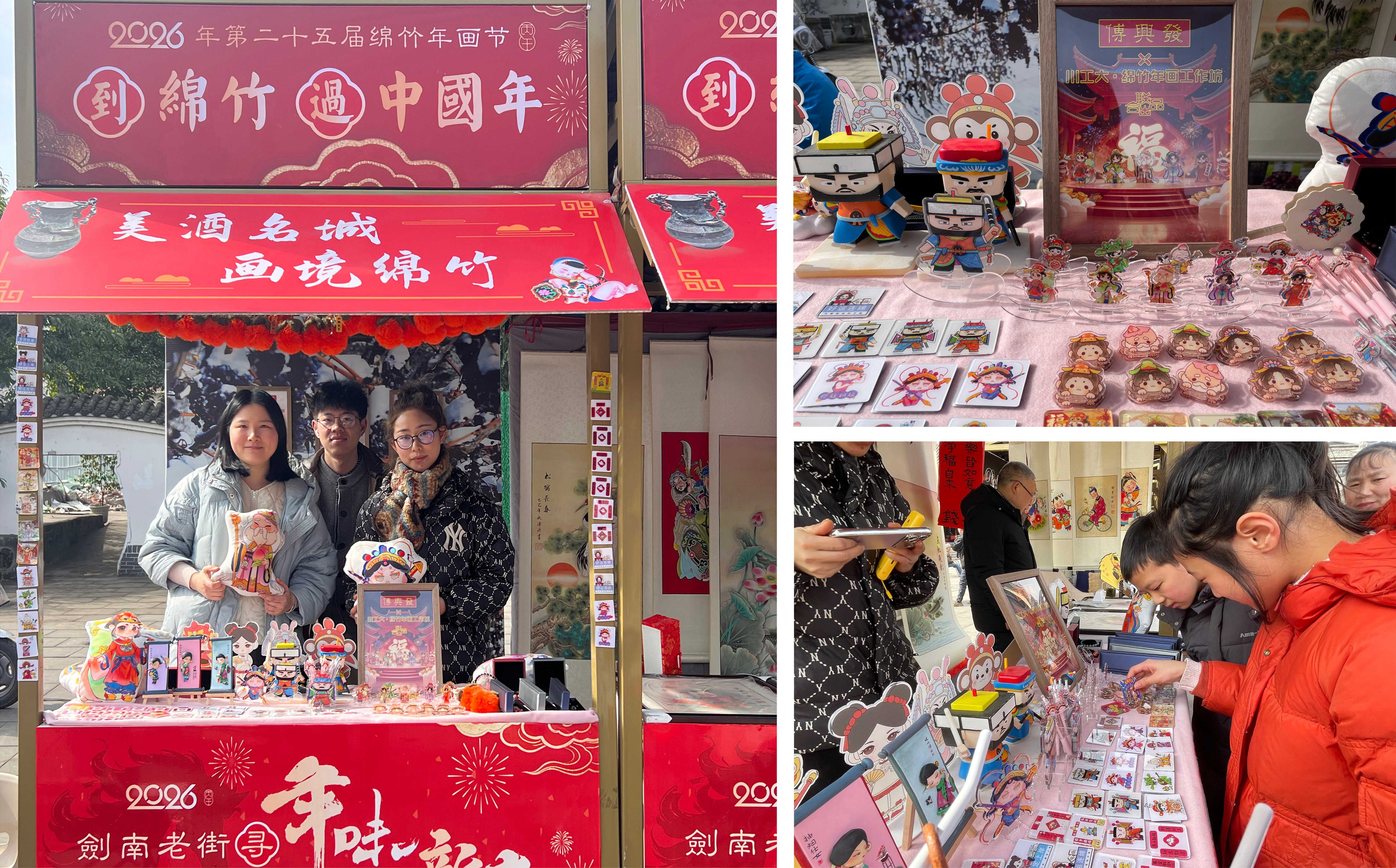 当天,众多游客走进剑南老街,驻足我校绵竹年画工作坊展位,在赏年画、选文创、品年味中,感受千年非遗的独特魅力。工坊指导教师余婞表示,再次参与绵竹年画节,旨在让工坊走出校园、对接市场,在真实的实践场景中提升非遗创新能力与文化传播能力,同时借助年画节这一优质平台,展示学校非遗育人成果,讲好川工大的非遗传承故事。参展过程中,工坊师生还现场分享了年画创作理念、非遗技艺知识,与游客开展了互动交流,进一步传播了绵竹年画文化,凝聚了非遗传承共识。