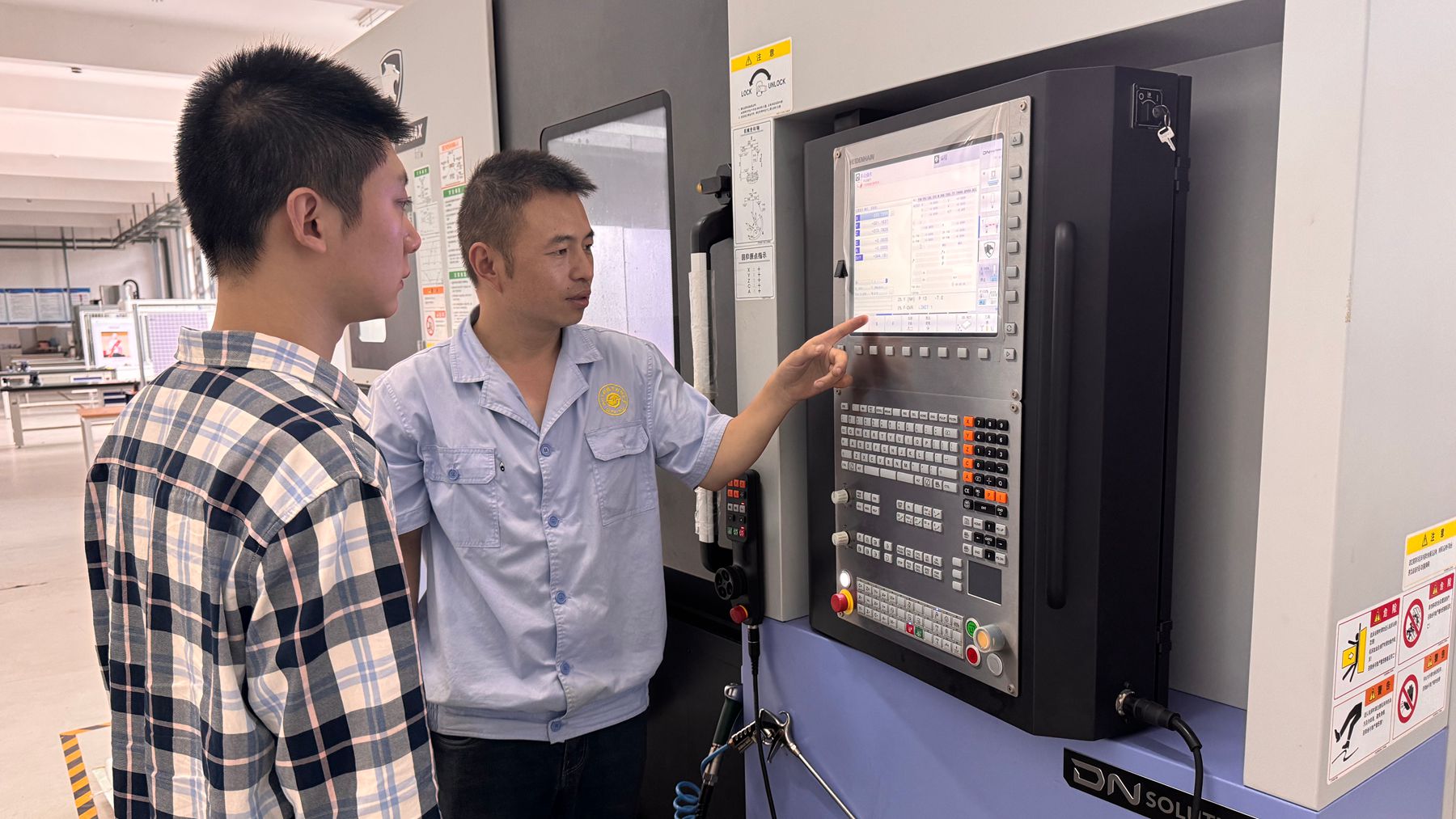 单成林正在对青年教师袁柳进行五轴机床操作指导
