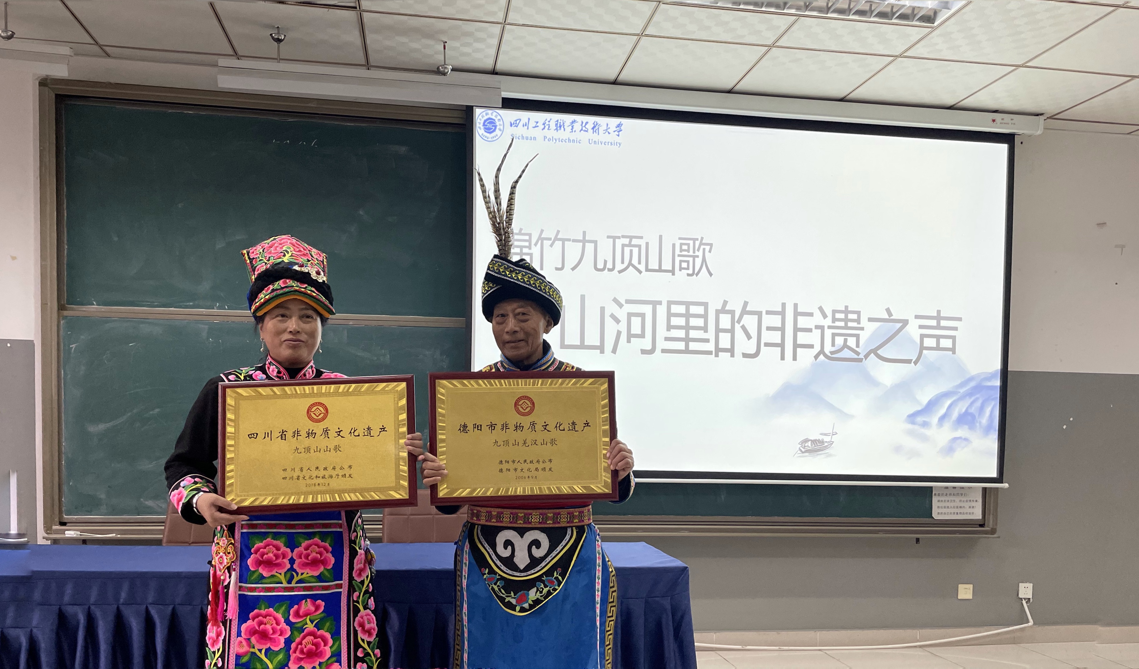 12月3日下午,教育学院中华优秀传统文化进校园活动如期举行。本次活动特别邀请到绵竹市清平镇省级非遗传承人、九顶山山歌协会会长孟开金与副会长蒋礼会,为全院师生带来了一场主题为《绵竹九顶山歌——山河里的非遗之声》的精彩讲座,让在场师生沉浸式感受了非遗文化的独特魅力。