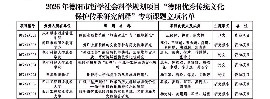 课题立项工作同样多点开花、成绩斐然。面对新一轮课题申报热潮,学院教师踊跃参与、精心筹备,凭借扎实的研究基础、新颖的研究视角和严谨的论证设计,成功斩获3项重要课题立项。其中,孔祥阳老师主持申报的《市调大赛驱动下职业本科新能源汽车专业“数智工匠”培养路径研究》,获准立项为中国商业统计学会2025年度规划课题职业教育专项攻关课题(课题编号:2025STZX19),聚焦职业本科特色专业人才培养新模式,助力“数智工匠”培育体系构建;杨海涛老师主持申报的两项课题均成功立项——《职教出海视域下Central Group销售人员“中文+销售”培训实践与反思》获四川省职业技术教育学会立项,紧扣职教出海战略,探索跨国技能培训新路径,赋能职业教育国际交流合作;《唐至清代咏德阳诗歌的意象系统、文化内涵与文旅融合研究》获2026年德阳市哲学社会科学规划项目“德阳优秀传统文化保护传承研究阐释”专项课题立项,深耕地方文化根脉,为德阳文旅深度融合发展提供有力学术支撑。