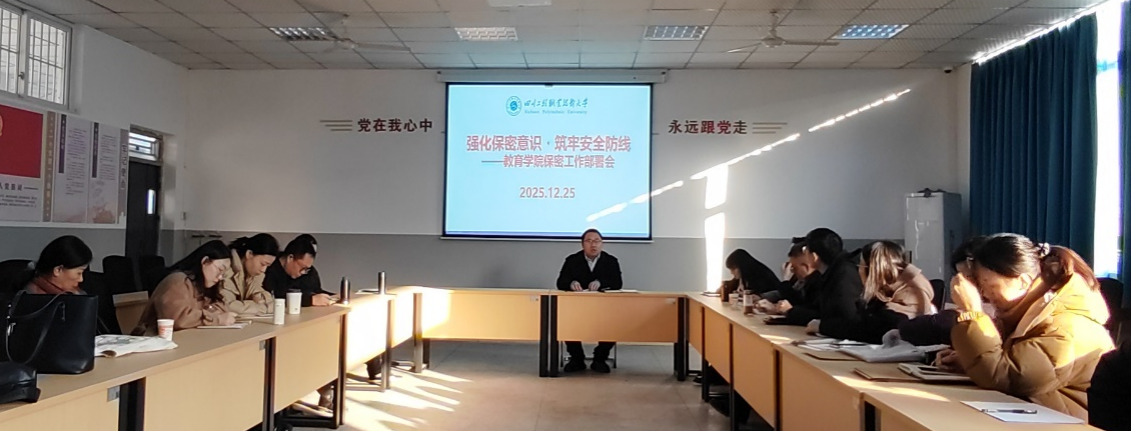 为全面提升全院教师的保密意识和防范技能,筑牢新时代校园保密安全屏障,12月25日,教育学院召开全体教师大会,围绕"强化保密意识・筑牢安全防线"主题部署学院保密工作。学院党政领导和全体教职工参会,会议由院长孔祥阳主持。