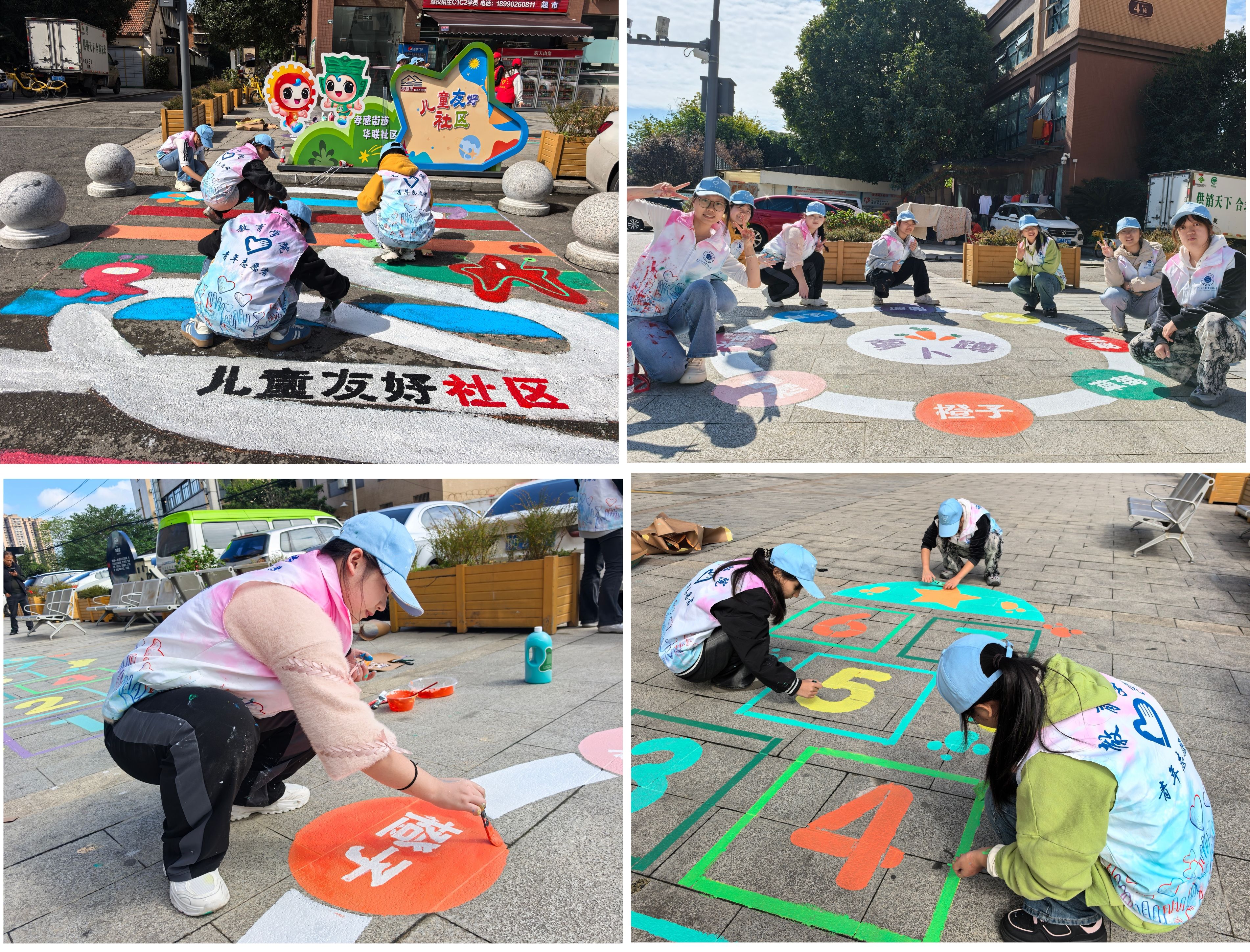 墙面彩绘营造视觉美感,地面游戏区提供活动空间,二者相辅相成,共同构建完整的儿童成长环境。华联社区党总支陈书记表示,志愿服务队的艺术创作不仅美化了社区环境,更构建起孩子们能玩、爱玩的友好空间,切实提升了居民的幸福感和获得感。服务队负责人表示,两次活动既践行了“奉献、友爱、互助、进步”的志愿精神,也让志愿者在实践中深化了对“儿童友好”理念的理解。未来,团队将继续聚焦社区需求,以更多元的艺术形式助力基层服务。