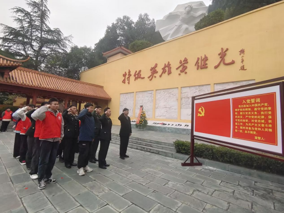 上午9时许,在工作人员的引领下,在特级英雄黄继光雕像前整队肃立,向黄继光塑像三鞠躬并献花。学院党委分管负责人张弦带领党员学生重温入党誓词。