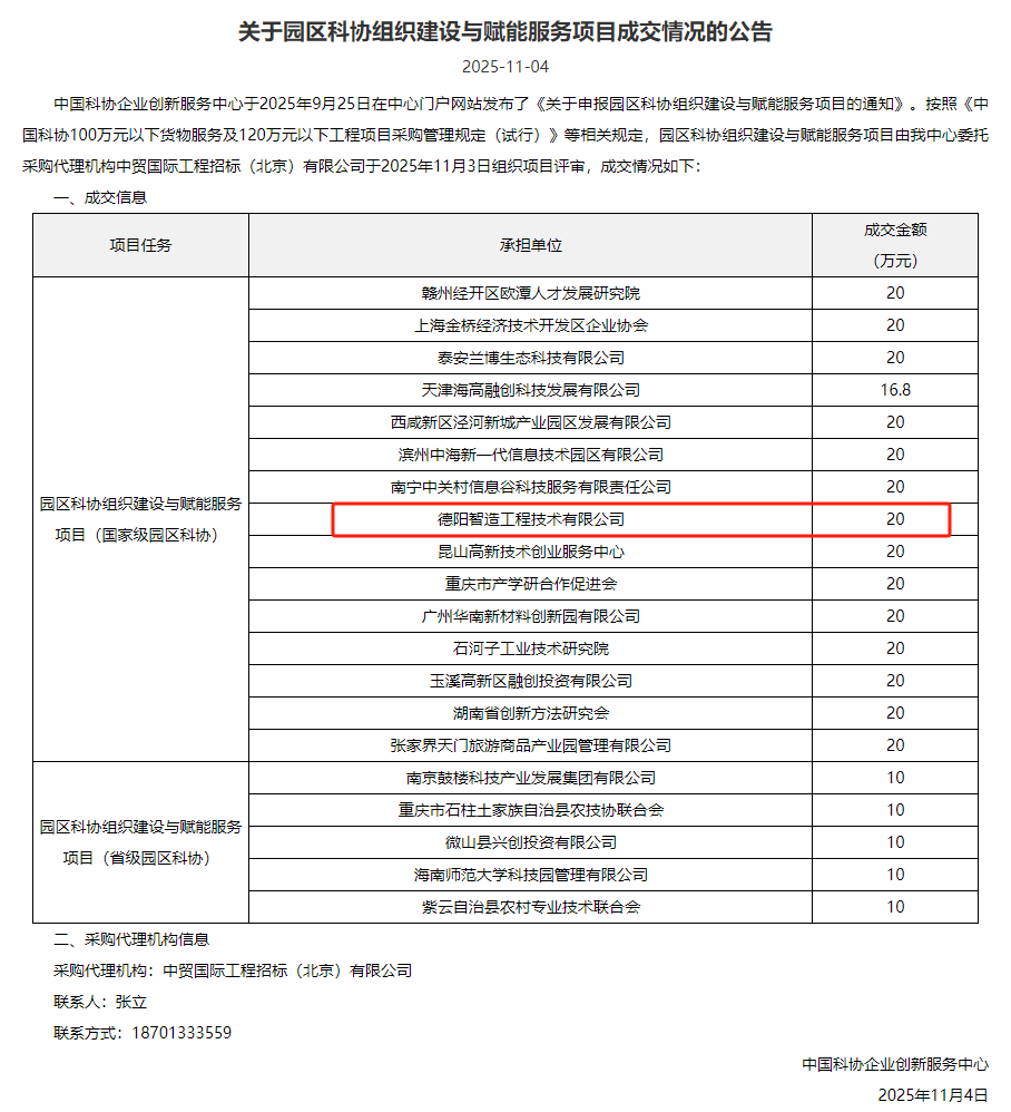11月4日,中国科协企业创新服务中心公布“园区科协组织建设与赋能服务项目”评审结果。德阳智造公司在德阳市科协、德阳经开区的指导下,从全国233家国家级经开区的激烈角逐中脱颖而出,成为15家项目承担单位之一,也是四川省内唯一中标单位。
